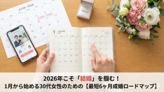 2026年中に結婚を掴みたい30代女性必見!1月から始めて6ヶ月で成婚するための最短ロードマップを徹底解説。婚活のゴールデンタイムである1月を活かす戦略から、相談所選び、自分磨き、プロポーズまでの全工程を完全ガイド。今年こそ幸せな結婚を叶えましょう。